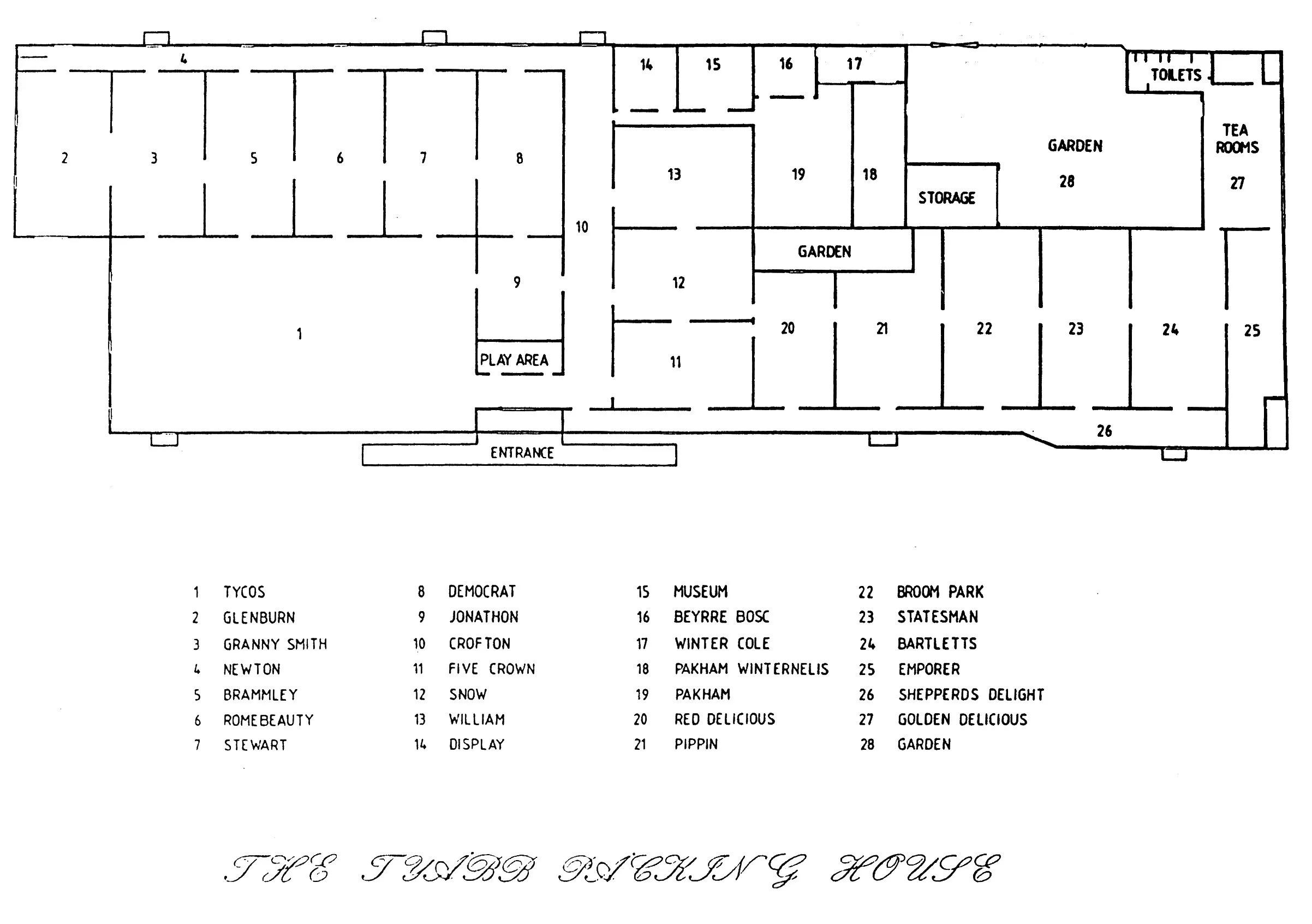 Chamber 1 - Tycos | Chamber 2 - Glenburn | Chamber 3 - Granny Smith | Chamber 4 - Newton | Chamber 5 - Brammley | Chamber 6 - Rome Beauty | Chamber 7 - Stewart | Chamber 8 - Democrat | Chamber 9 - Jonathon | Chamber 10 - Crofton | Chamber 11 - Five Crown | Chamber 12 - Snow | Chamber 13 - William | Chamber 14 - Display & Chamber 15 - Museum | Chamber 16 - Beurre Bosc | Chamber 17 - Winter Cole | Chamber 18 - Winter Nelis | Chamber 19 - Packham | Chamber 20 - Red Delicious | Chamber 21 - Pippin | Chamber 22 - Broom Park | Chamber 23 - Statesman | Chamber 24 - Bartletts | Chamber 25 - Emporer | Chamber 26 - Sheppards Delight | Chamber 27 - Golden Delicious | Chamber 28 - Garden | Garden in the middle |